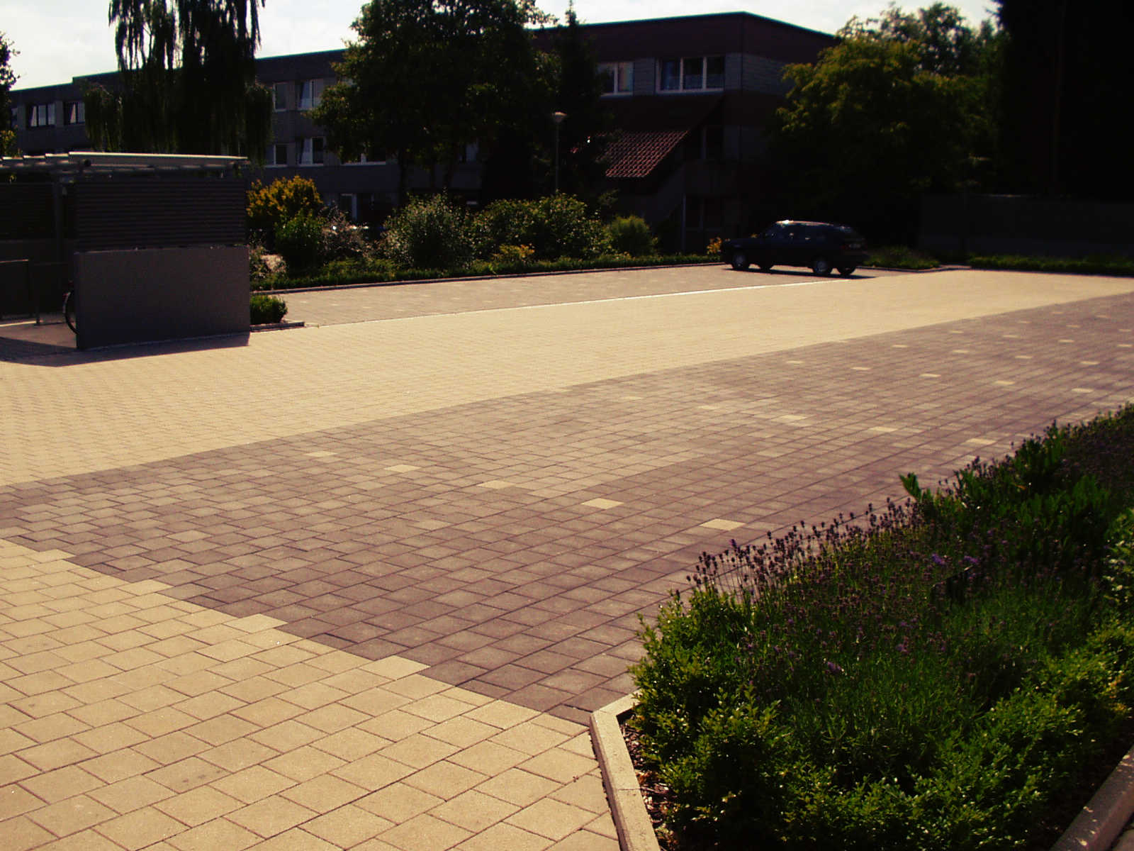 Der Eingangsbereich wurde aus einem Porphyrpflaster im Schuppenmuster gesetzt. Die Treppenanlage wurde aus den Blockstufen "Victorgranit" angelegt. Des Weiteren wurden Parkplätze auf einer Tiefgarage, bestehend aus einer Pflasterung mit einer Integrierung von Grünbeeten, installiert. Für eingeschränkte Kunden wurden Parkreservierungen, mit einem Emblem aus Edelstahl, geschaffen.